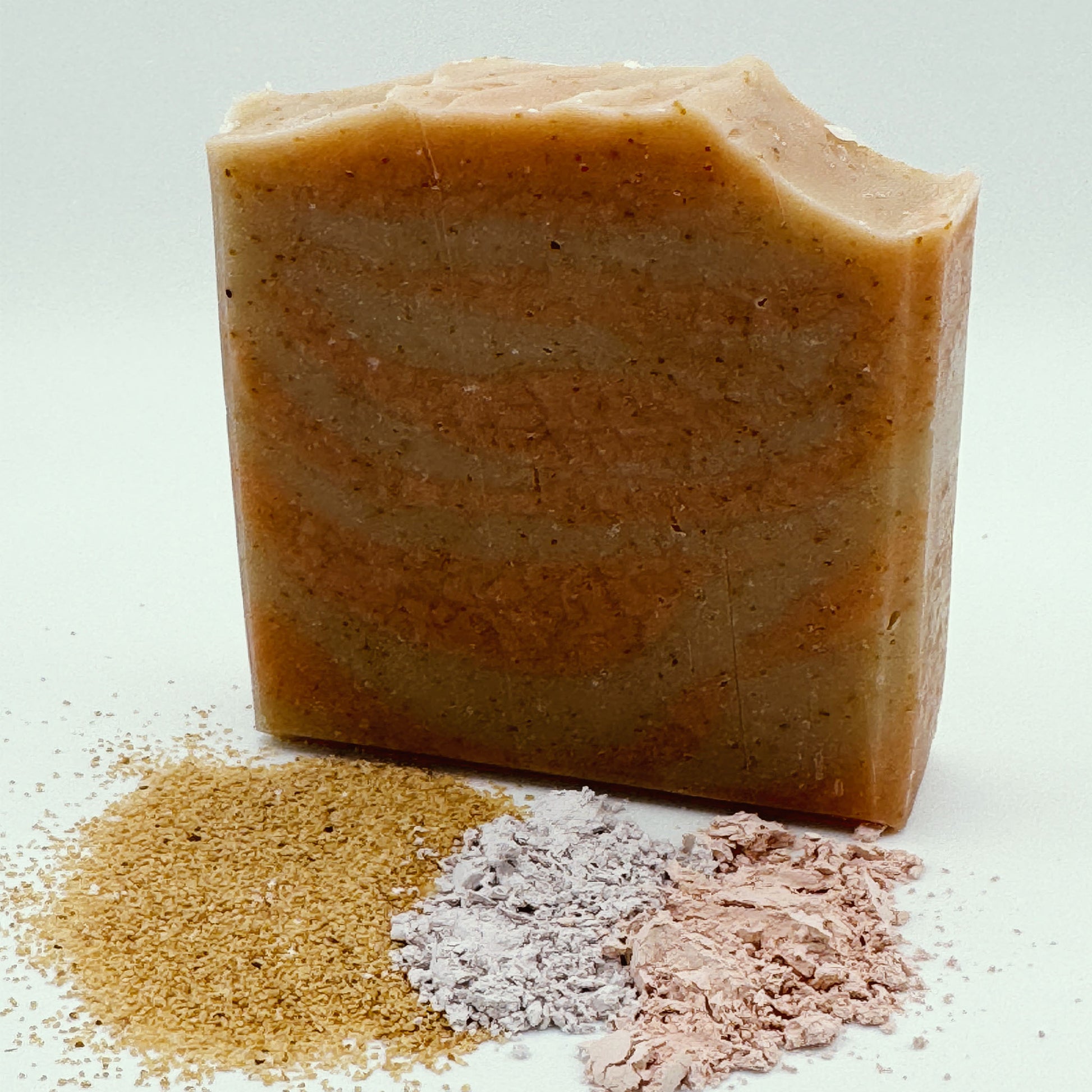 Classic lavender essential oil meets fresh rosemary in a calming yet invigorating pairing. Olive stone exfoliation enhances the texture, while purple Brazilian and pink French clays add soft, natural hues. Traditionally prized in beauty rituals, these clays bring a refined artisanal feel to this handcrafted soap.